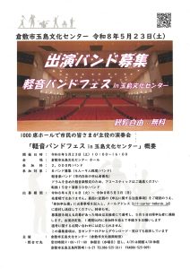 玉島文化センターでは、「軽音バンドフェスin玉島文化センター」を今年はじめて開催します。